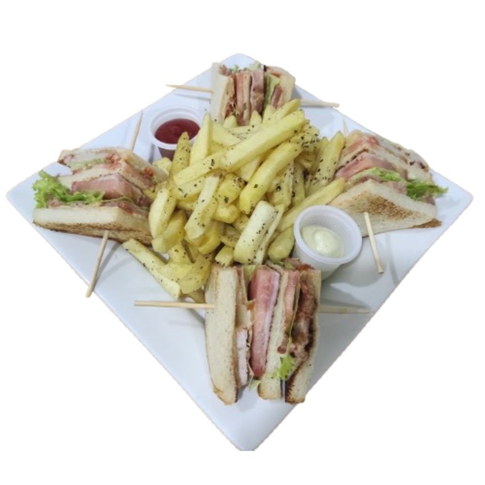 Nuestra versión más robusta del clásico. Tres pisos de pan perfectamente tostado rellenos de jugosa carne de pierna de cerdo, jamón, queso derretido y vegetales frescos.